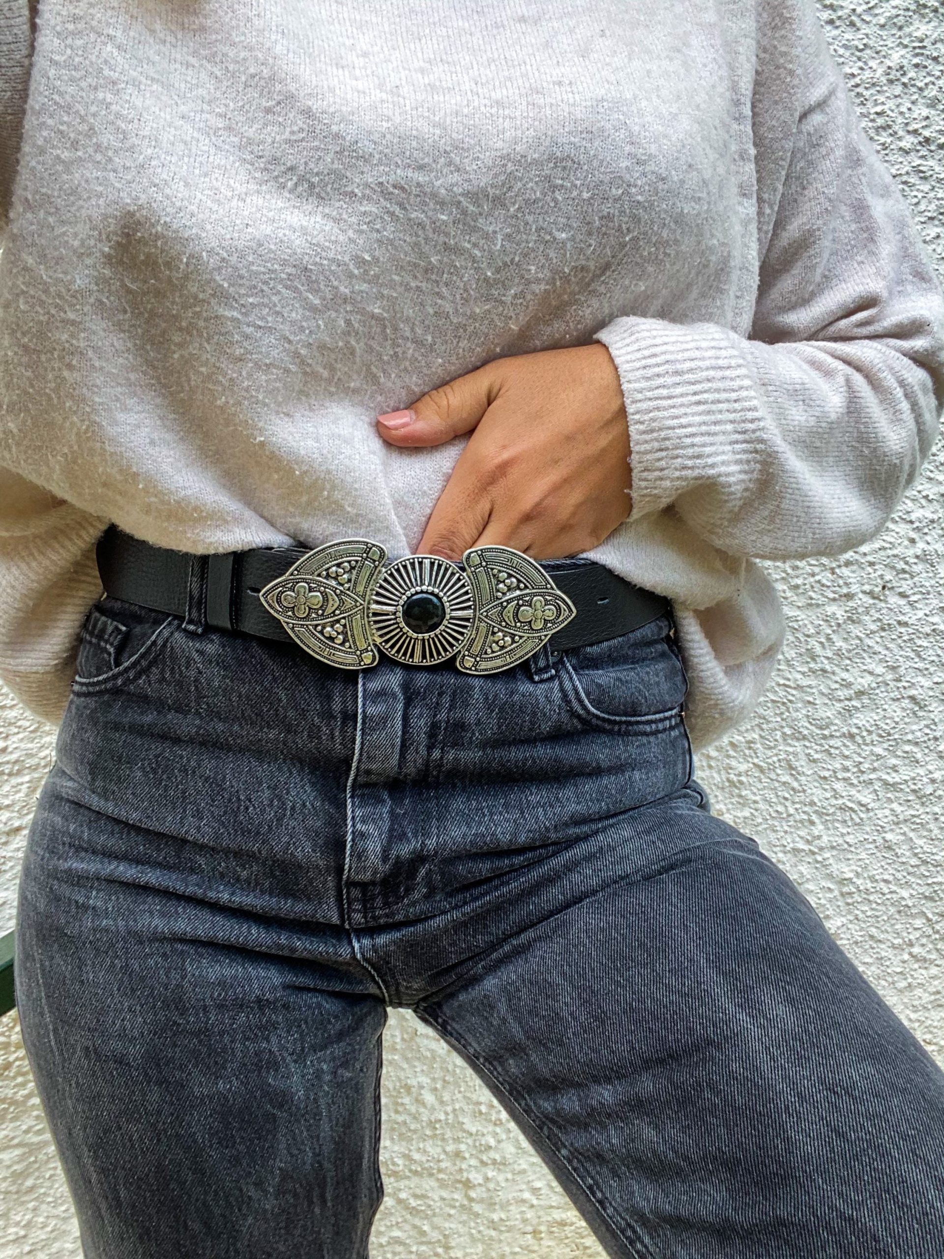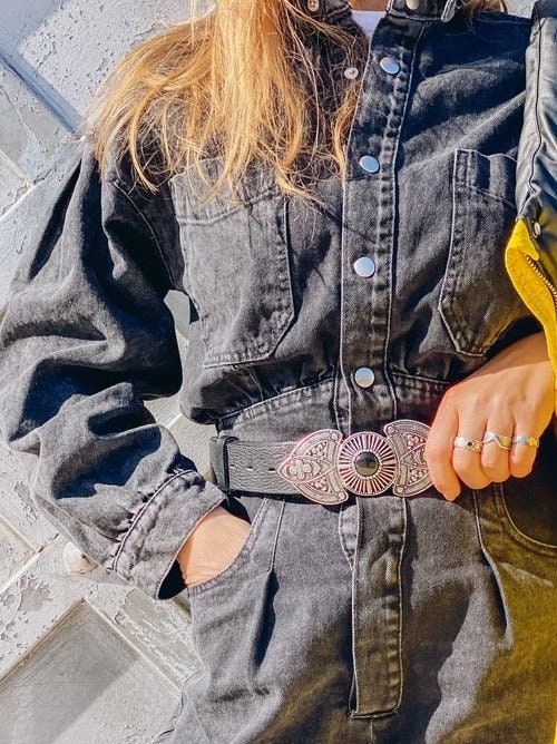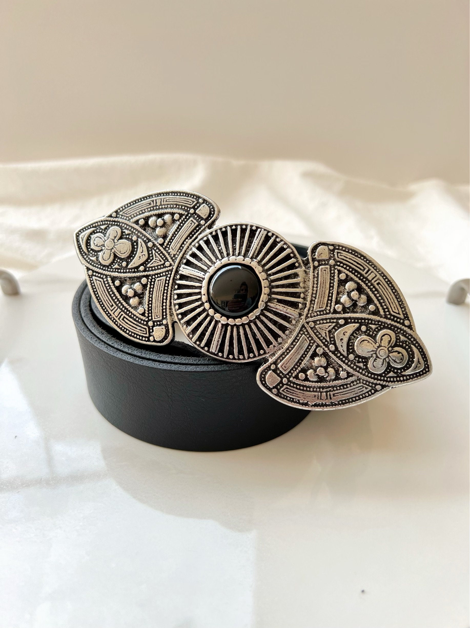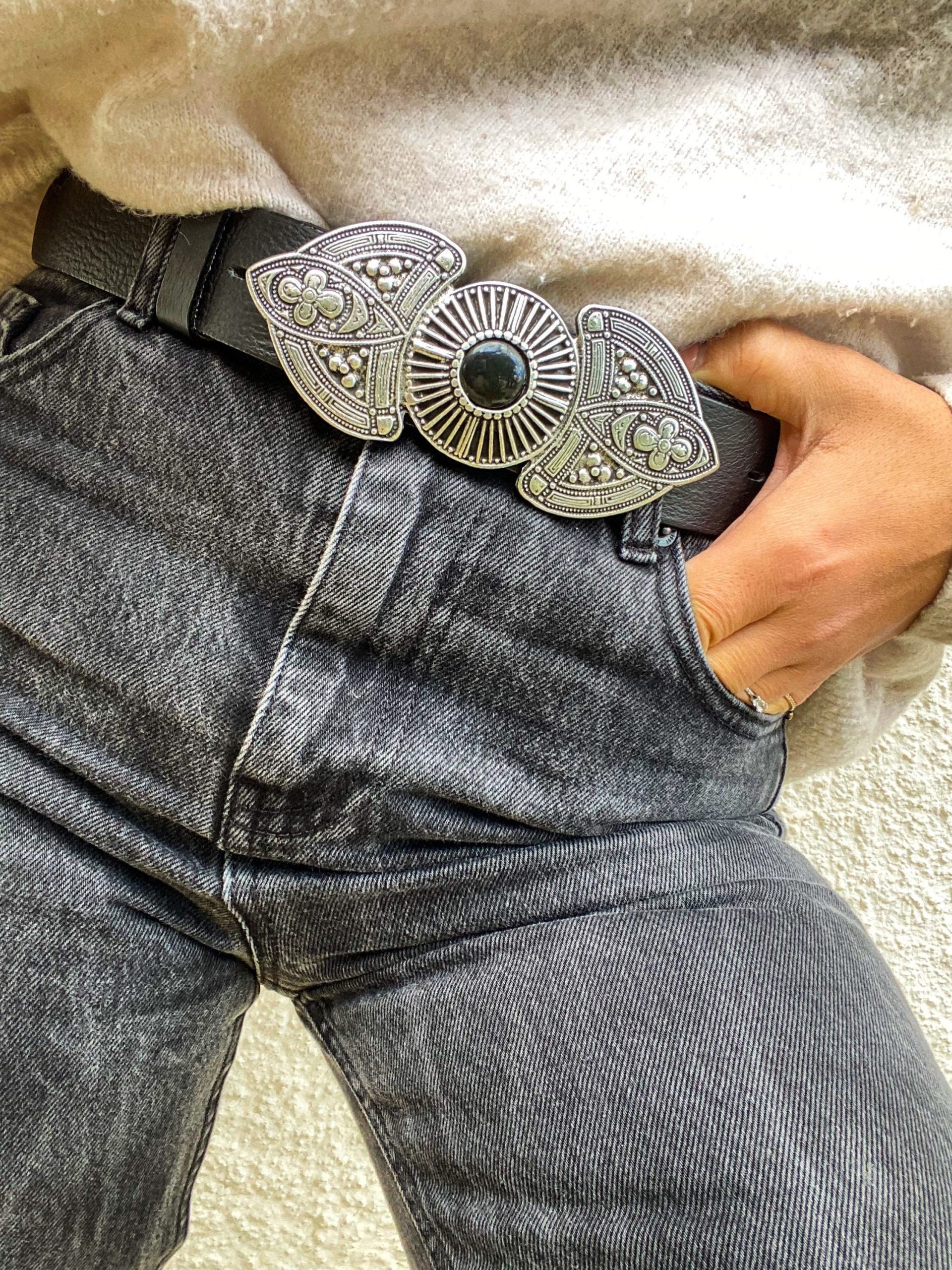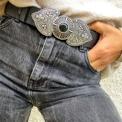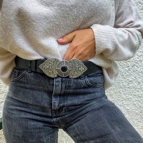 A Unique Leather Belt for women that is made from Real Genuine Leather in black color, with a special silver Buckle at the middle, that makes it really different from all the others. Choose the ideal length for you between 8 different dimensions. (THE DIMENSIONS ARE FOR BELT NOT FOR YOUR WAIST). Find it only at us Store.