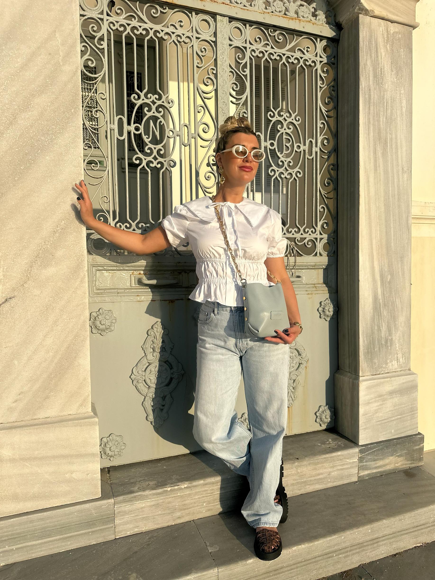 Handmade Blue Leather Bucket Bag Women Purse Gold
