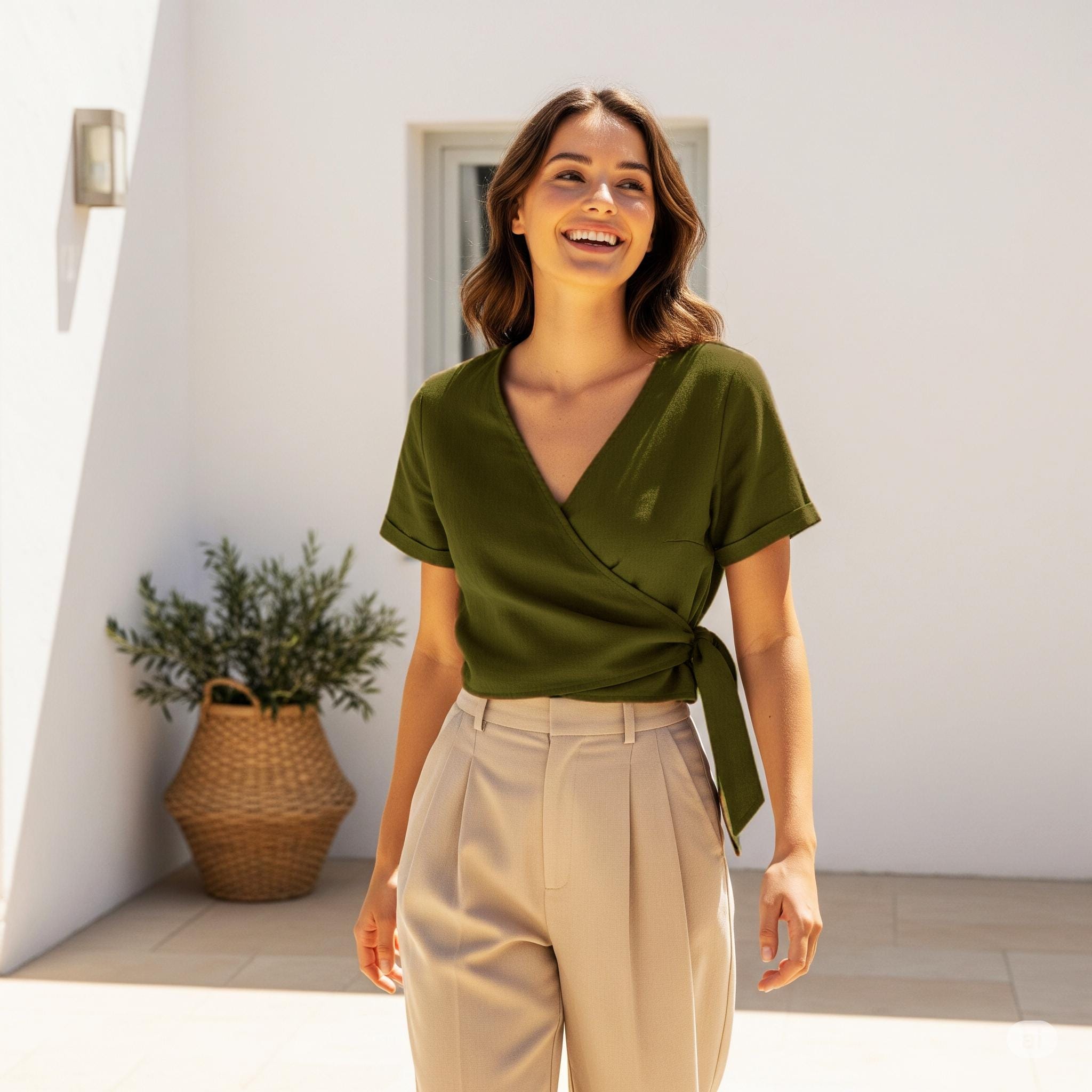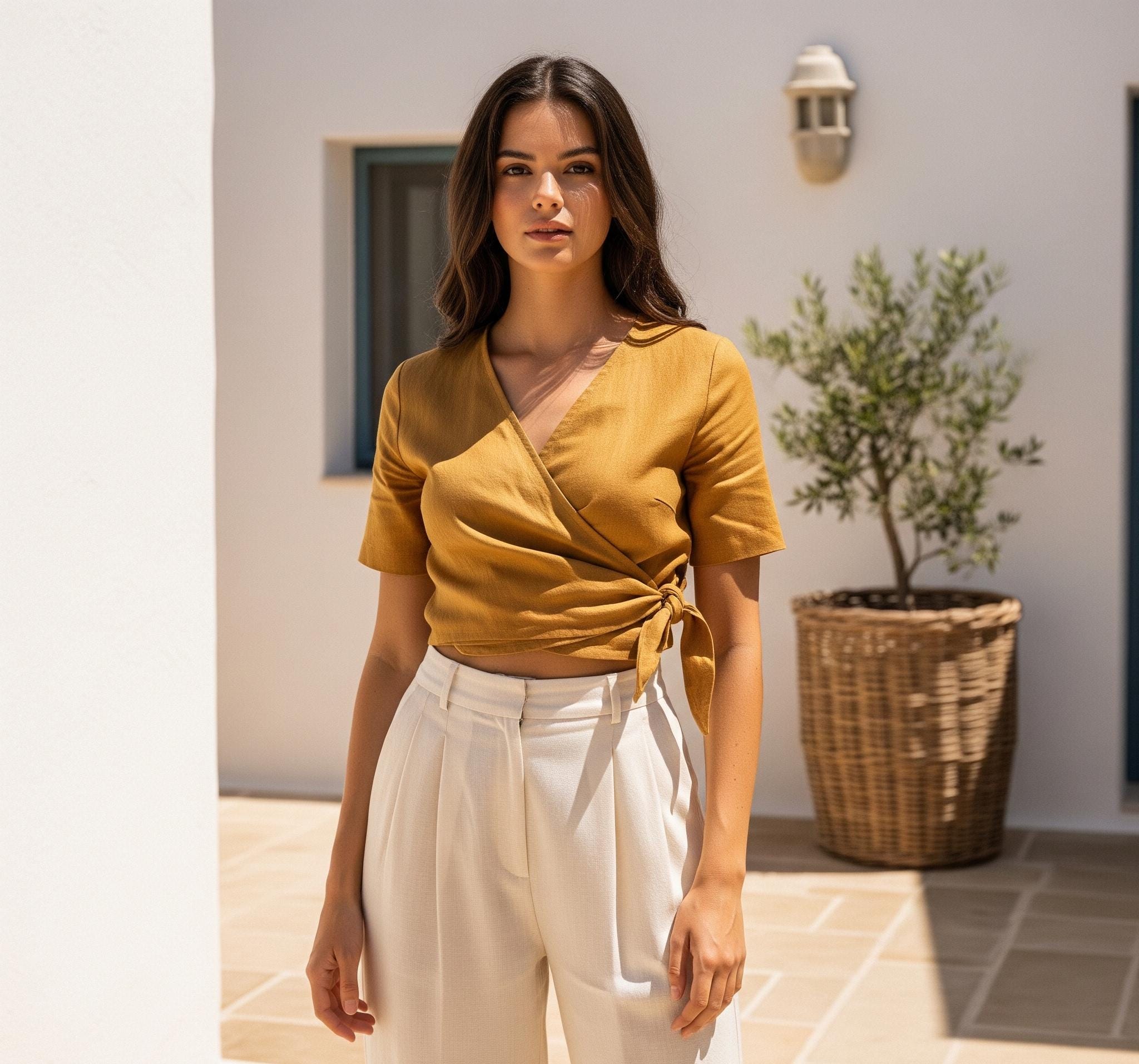 Elle Top – Wrap Linen Top – Summer Wrap Linen Top – Women Wrap Top – Green Linen Top – Short Sleeve Linen Top – Wedding Linen Blouse