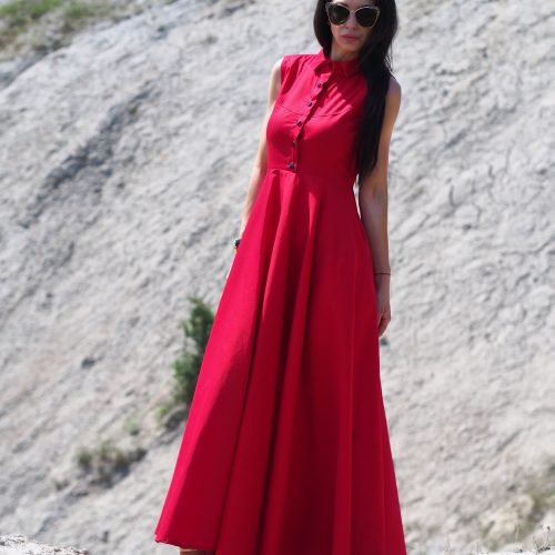 Sleeveless Red Shirt Dress Elegant Collared Maxi With