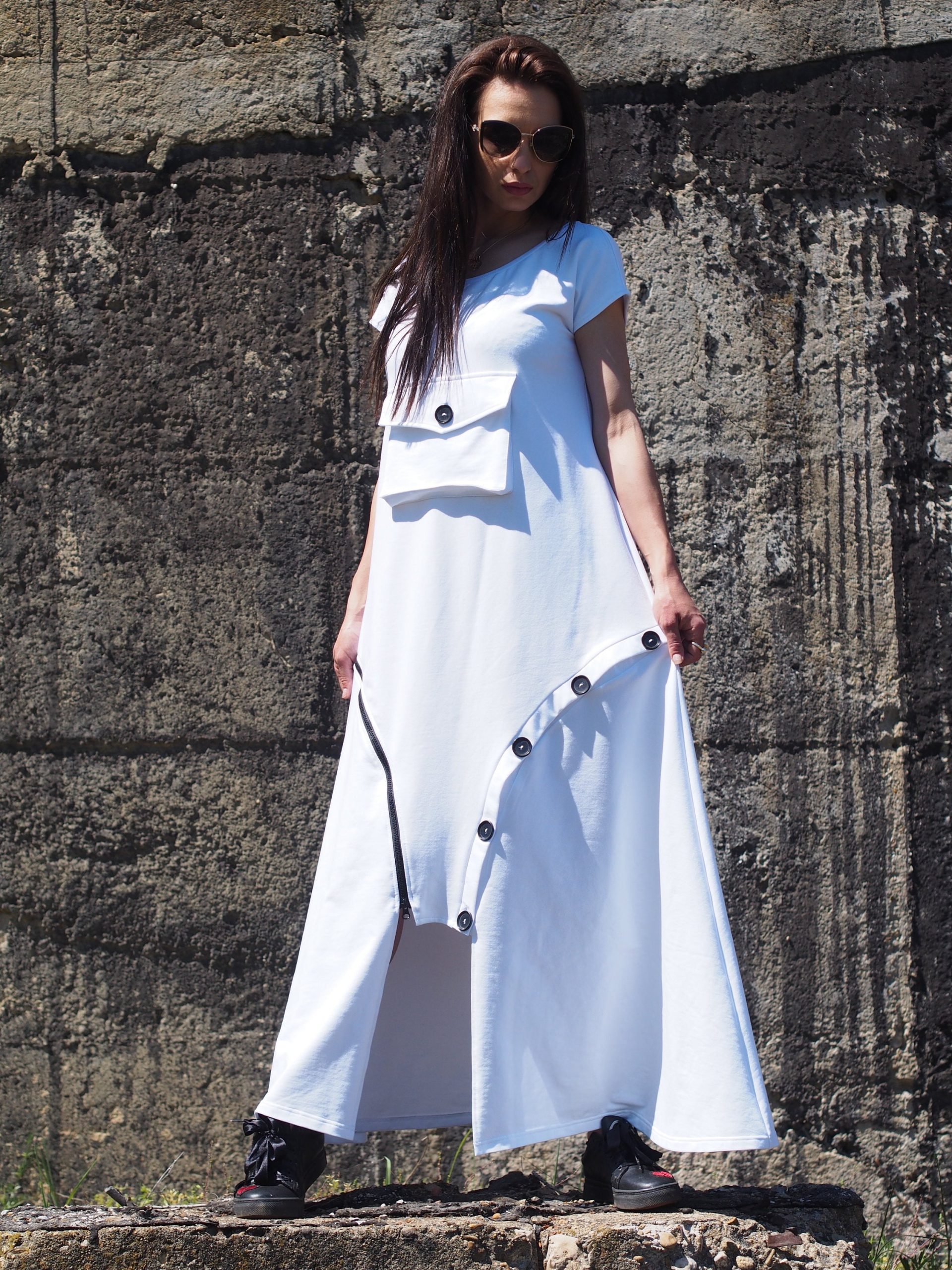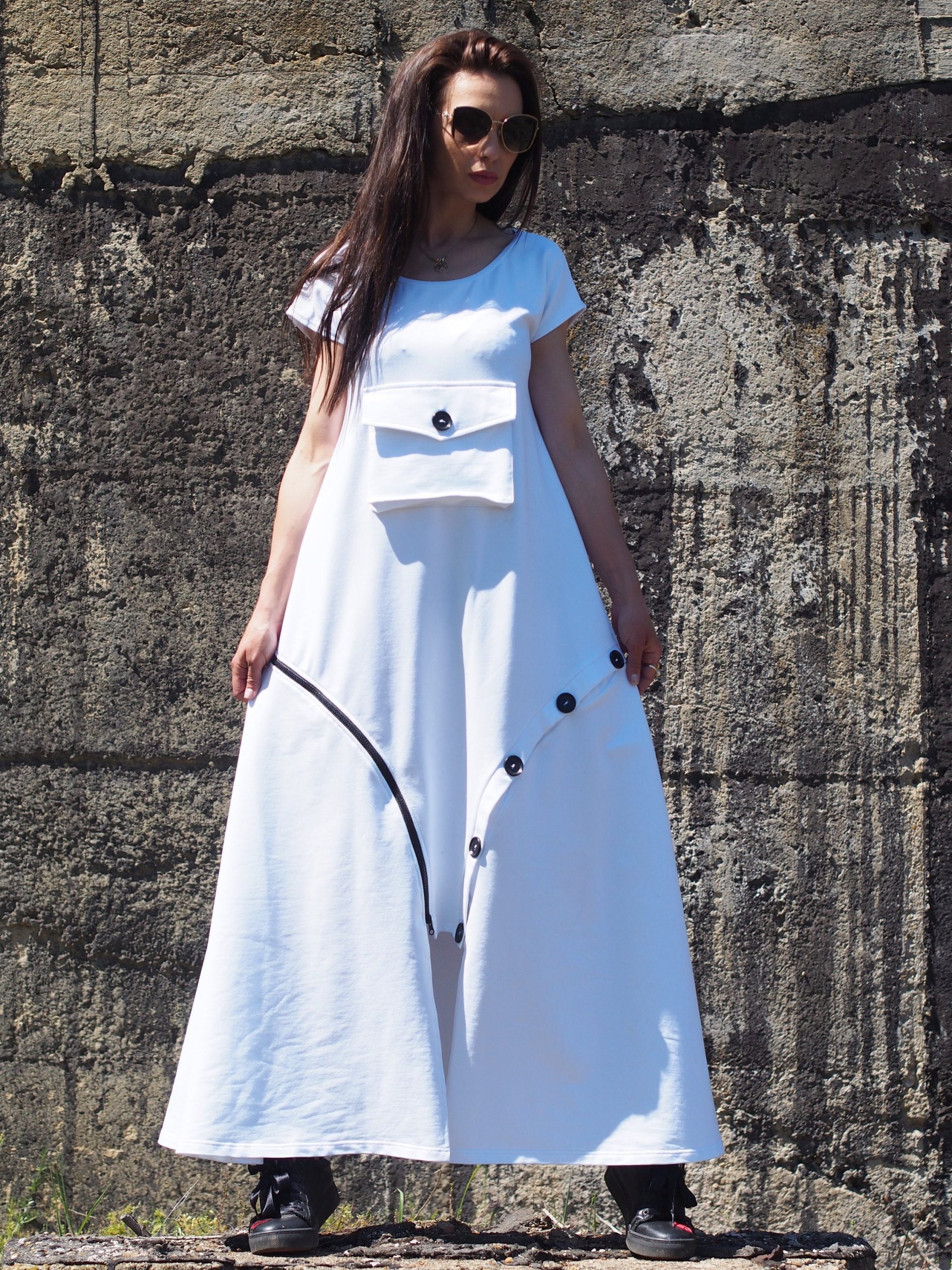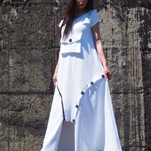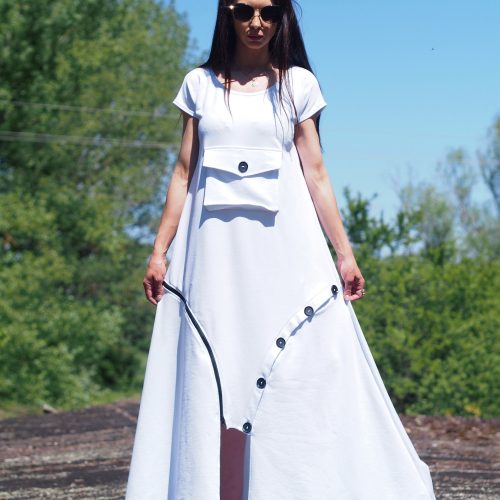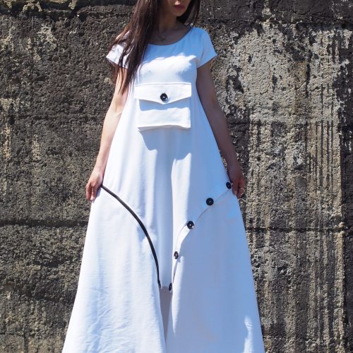 Step into effortless elegance with this unique white maxi dress, crafted from breathable cotton fabric. This contemporary piece features a flattering A-line silhouette, a front statement pocket with a button, and asymmetrical decorative buttons that add an artistic touch to the hemline. Comfortable yet bold, it s perfect for summer days, art events, casual strolls, or a standout vacation outfit.