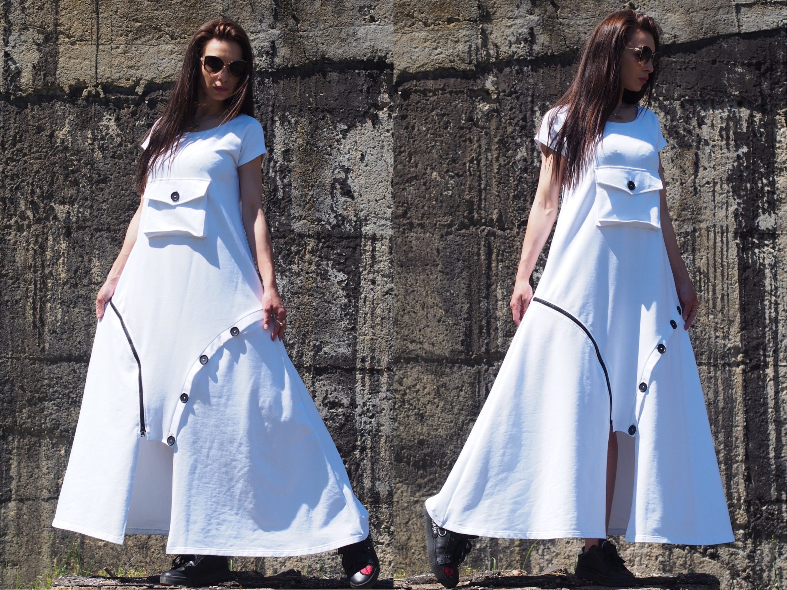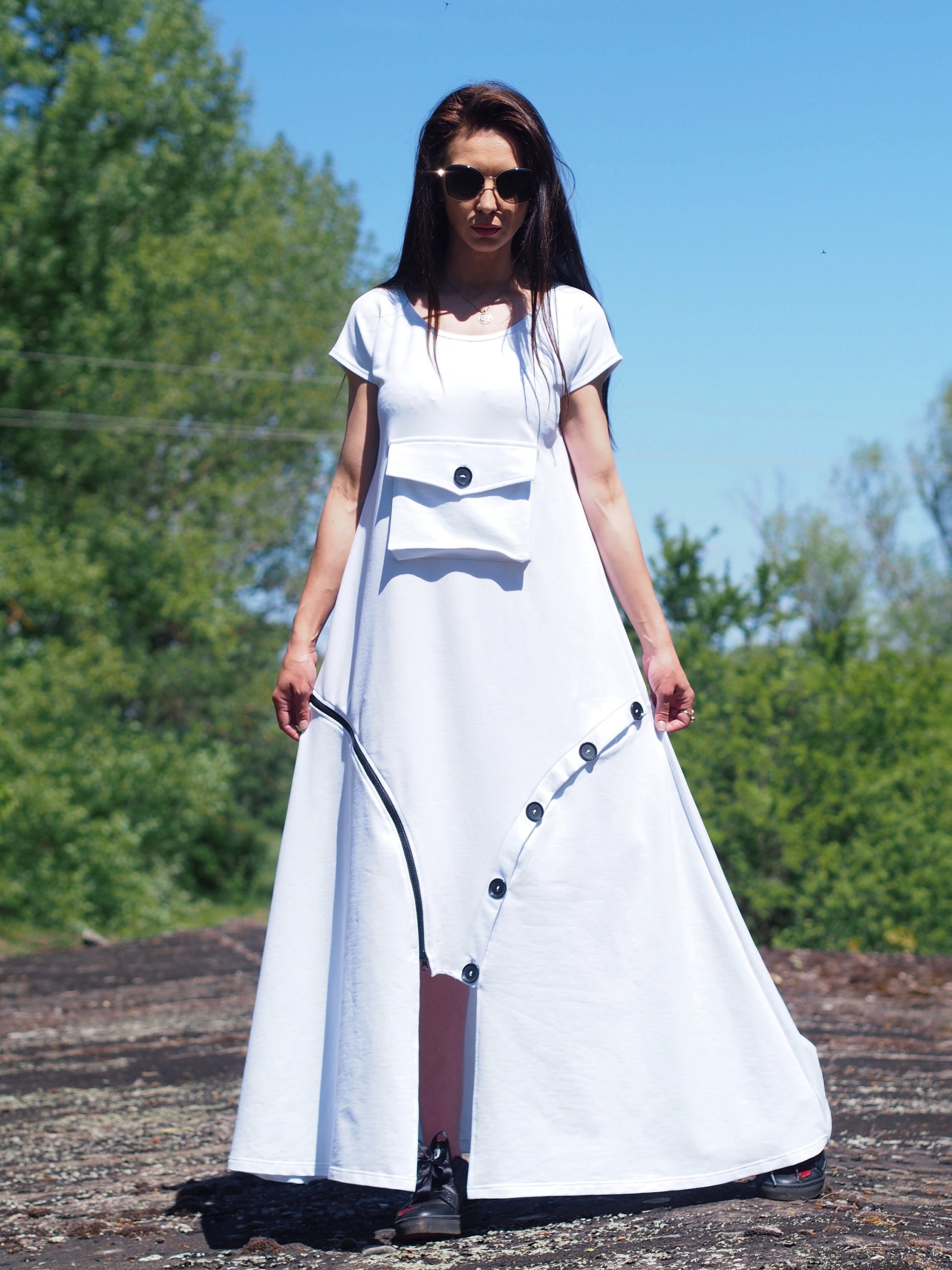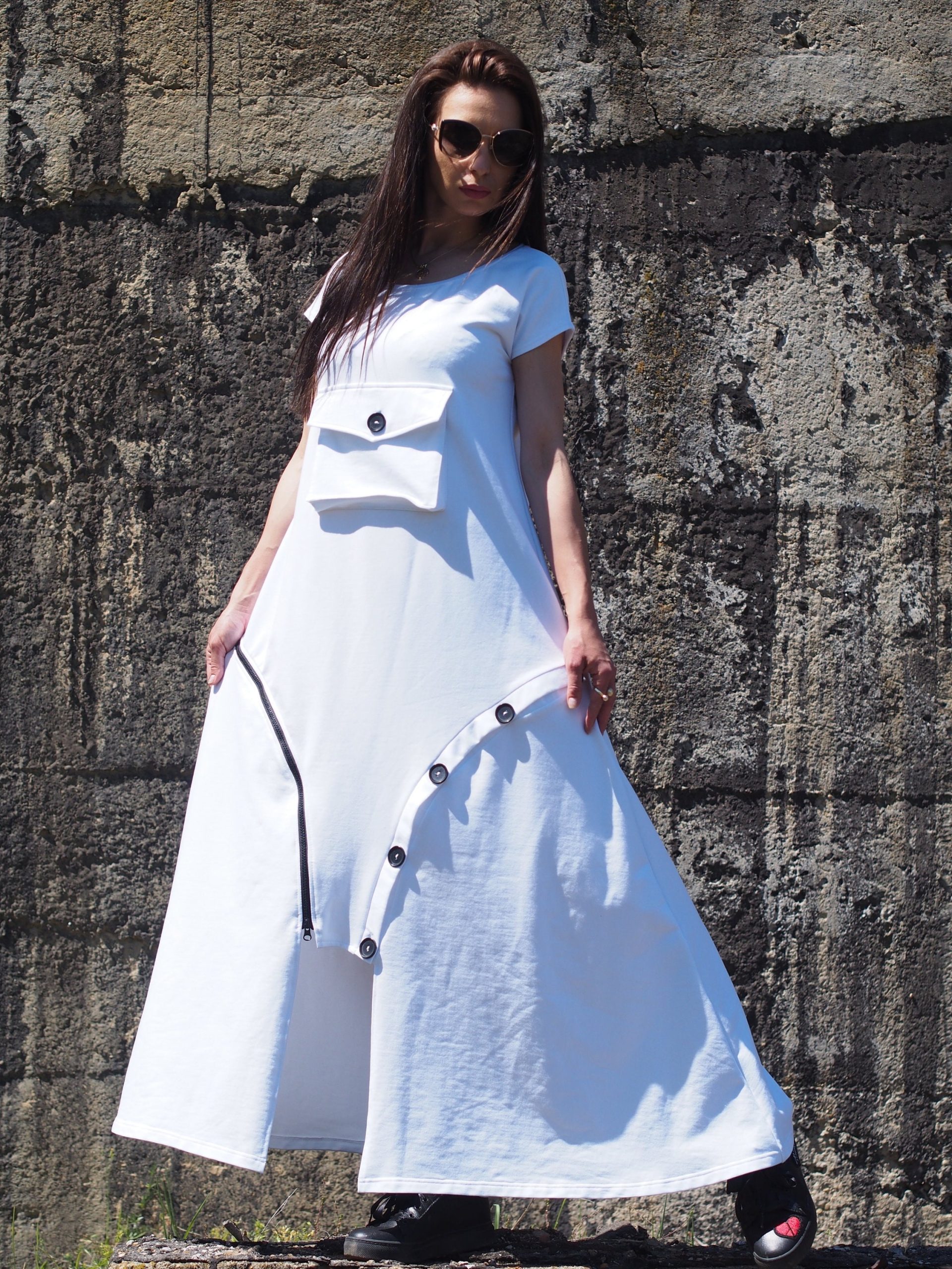 Step into effortless elegance with this unique white maxi dress, crafted from breathable cotton fabric. This contemporary piece features a flattering A-line silhouette, a front statement pocket with a button, and asymmetrical decorative buttons that add an artistic touch to the hemline. Comfortable yet bold, it s perfect for summer days, art events, casual strolls, or a standout vacation outfit.